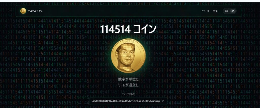 正式には114514コインであり「日本発のミームコインでありながら1万倍の超高騰」をみせたことから話題となりました。