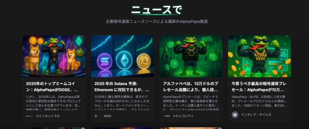 Alpha Pepe は「次世代のPEPE系ミームコイン」としてプレセールが始まり仮想通貨投資家から注目が集まっています。その安全性、高利回りのステーキング、コミュニティ力から高騰への期待値も高まっています。