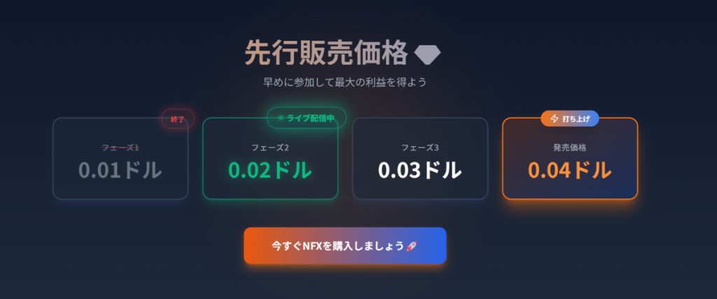 価格上昇のステップ: プレセールの段階(Phase 1〜3)を経て、ローンチ価格($0.04)まで段階的に価格が上がる仕組みで、早期参入者にメリットがある設計でした。